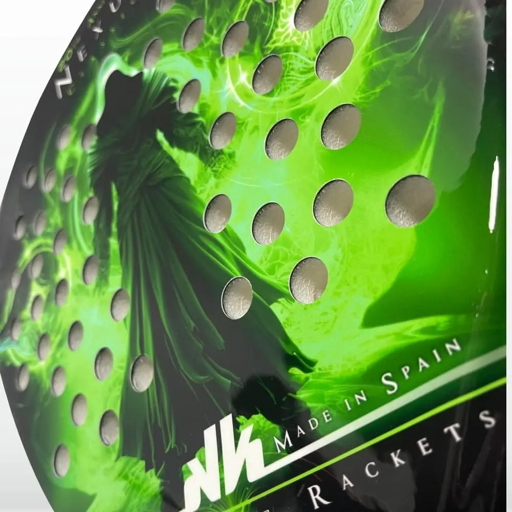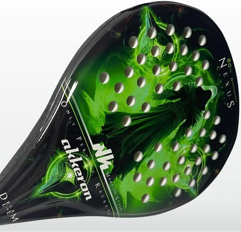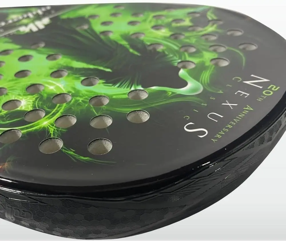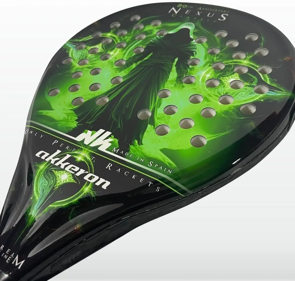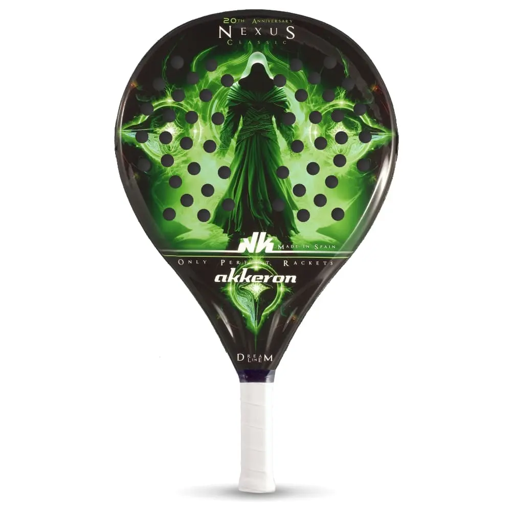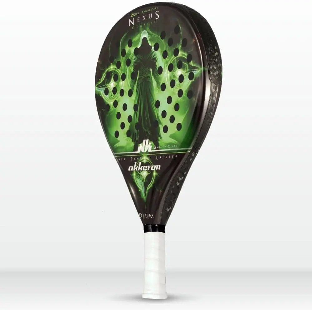 La raquette de padel Nexus 20ème modèle de la collection Dream Line d’Akkeron intègre un nouveau protecteur de pointe, avec un design renouvelé, qui couvre tout le côté pour une protection totale, ainsi que la possibilité de nouveaux contrepoids pour équilibrer le produit comme prévu . vous souhaitez et obtenez un type de solde plus personnalisé. Ce protecteur est conçu pour ne pas affaiblir le cadre, car il n’est pas percé mais collé en trois parties, et peut être remplacé sans problème s’il est endommagé par un nouveau, laissant le produit complètement intact et prêt pour le jeu en quelques secondes.